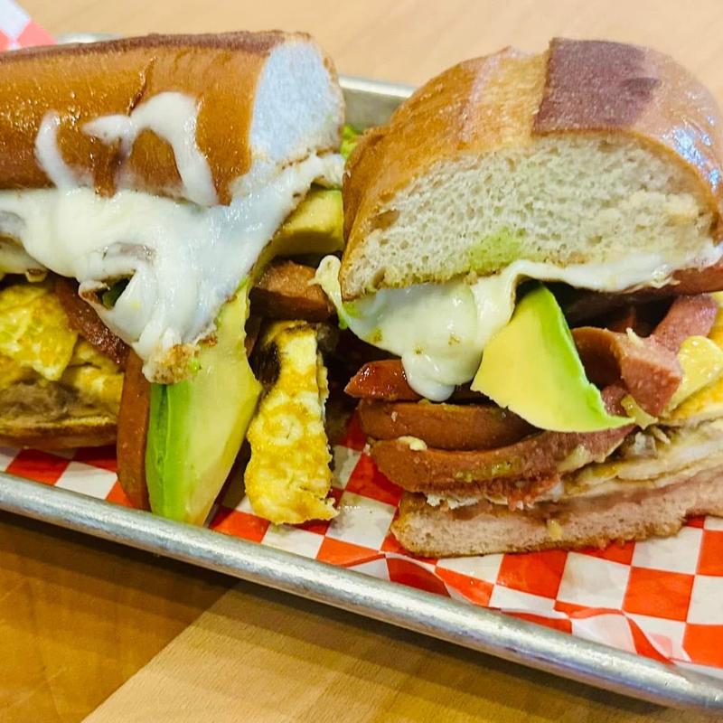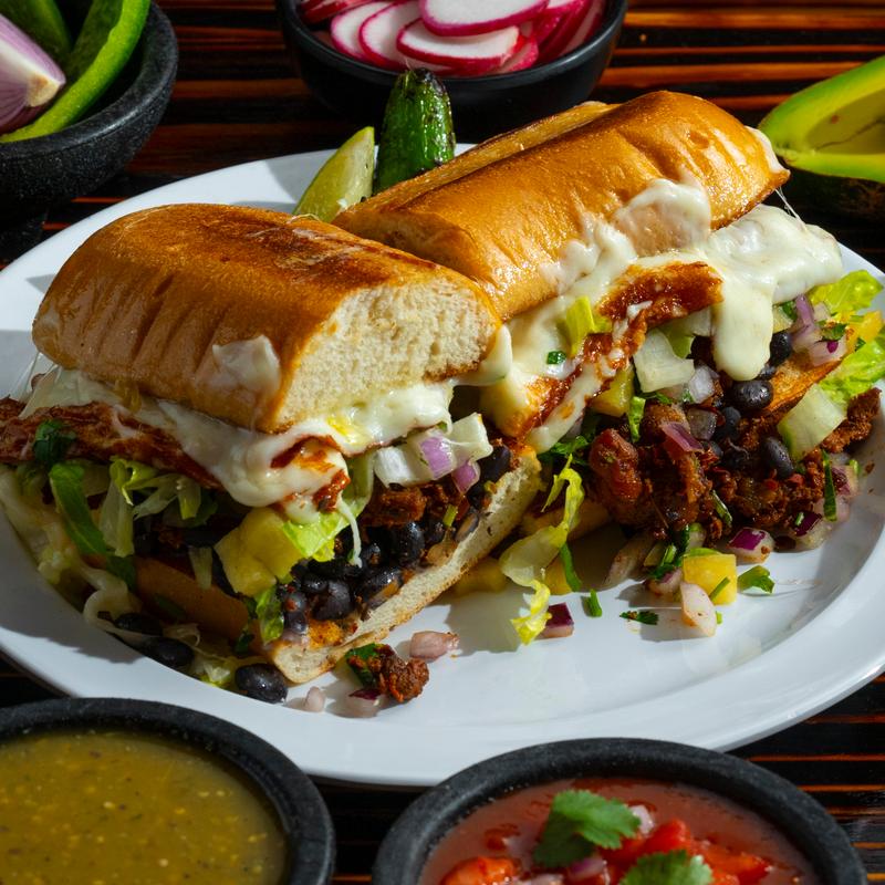 Toasted sourdough bread filled with choice of beans, eggs, sausage, choice of meat or veggie, cheese, fresh avocado with salsa de rajas.