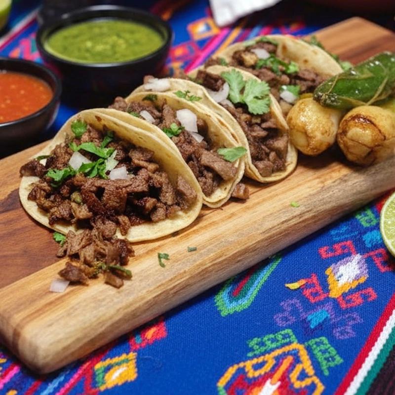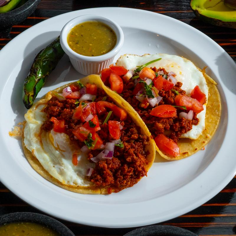 Two 6” corn tortillas with your favorite meat choices, fried eggs, pico de gallo, and salsa.