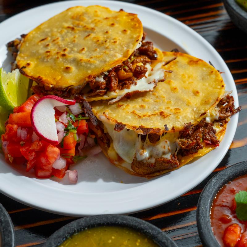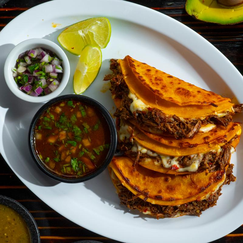 Three double 6” corn tortillas filled with mozzarella cheese and tender shredded birria beef, served with a side of consome dip, fresh cilantro, and onions.