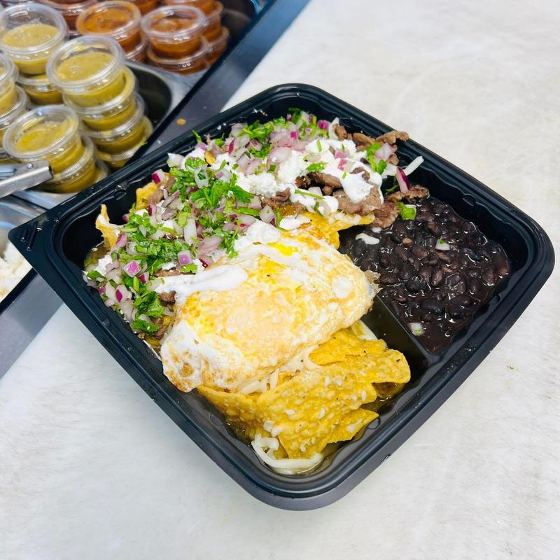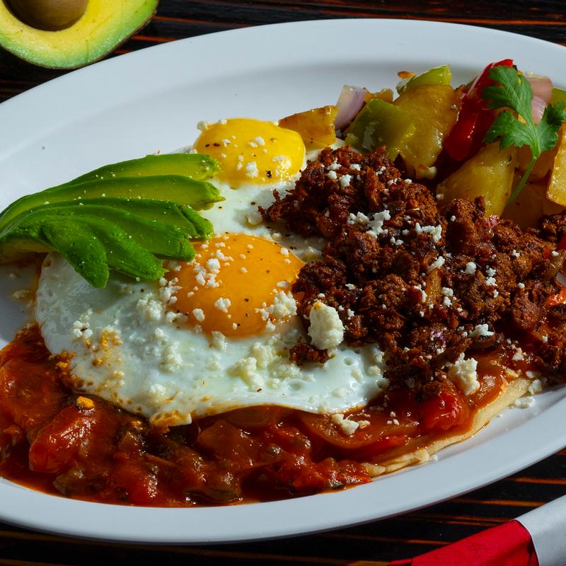 Fried corn tortillas simmered in habanero hot salsa verde, topped with two fried eggs, your favorite choice of meat, cilantro, onions, sour cream and queso fresco. (The eggs could be done over easy, over medium, over hard, sunny side up, or scrambled.)
