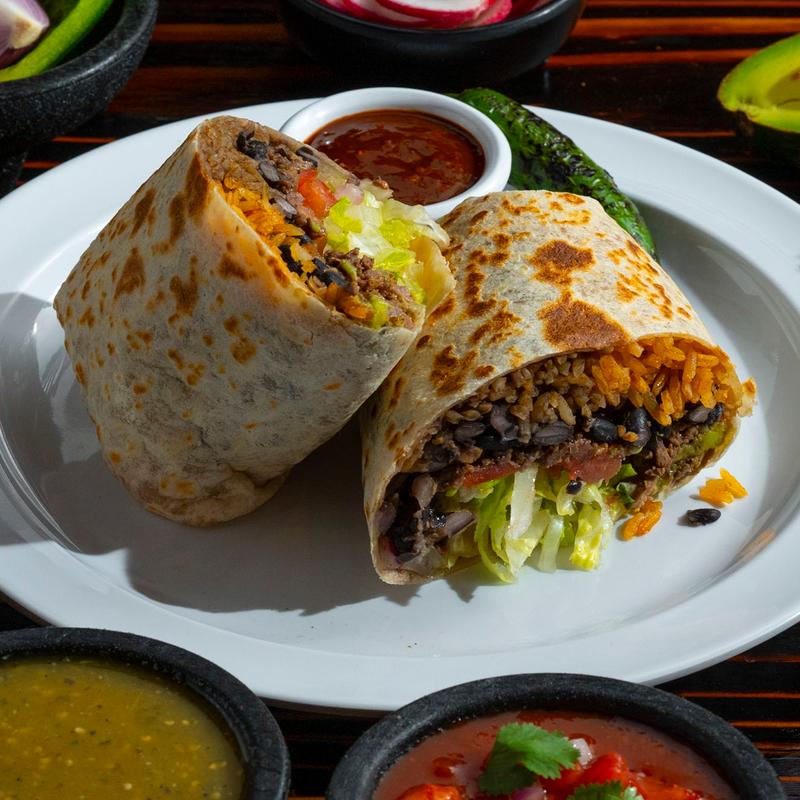 Large 14” flour tortilla filled with rice, choice beans, your favorite meat choice, lettuce, pico de gallo, guacamole, and