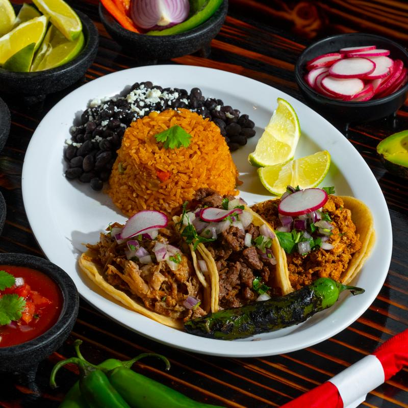Three Street Soft Tacos, your favorite choice of meat, served with rice and choice beans.