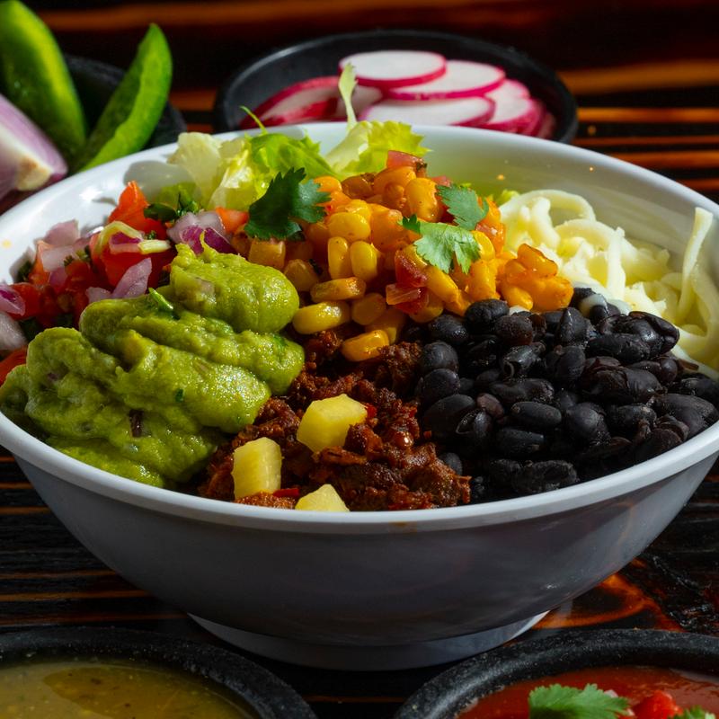 Burrito in a bowl, your favorite choice of meat, rice, choice beans, lettuce, pico de gallo, guacamole, shredded cheese, and salsa.
